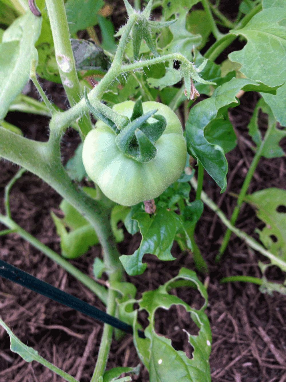 I have two tomato plants in one of the raised beds, snuggled up with some chard and spinach. In the second bed I also have rosemary, thyme, peppermint, fennel and a single ornamental plant. I also have a series of containers in which I’ve planted basil, comfrey, lemon balm, catnip, zucchini, echinacea, eggplant and pumpkin.